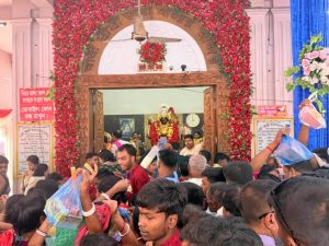 মন্দির পরিচালনা কমিটির সাধারণ সম্পাদক সঞ্জয় কুমার পাল জানান, আজ শনিবার সকাল থেকেই যথাযথ ধর্মীয় আচার-অনুষ্ঠানের মধ্য দিয়ে পূজার কার্যক্রম শুরু হয়েছে। মন্দিরের পুরোহিত শ্রী অজয় মৈত্রের পরিচালনায় দিনব্যাপী কর্মসূচির মধ্যে রয়েছে— সকালে চণ্ডীপাঠ ও শীতলা পূজা এবং দুপুরে বলিদান। কর্মসূচির পরবর্তী অংশে রয়েছে বিকালে গীতাপাঠ এবং সন্ধ্যায় মায়ের সামনে বিশেষ আরতি প্রতিযোগিতা। এছাড়া রাতে ভক্তদের মাঝে প্রসাদ বিতরণ, শিবাভোগ এবং গভীর রাত পর্যন্ত ধর্মীয় সংগীতানুষ্ঠানের আয়োজন করা হয়েছে।