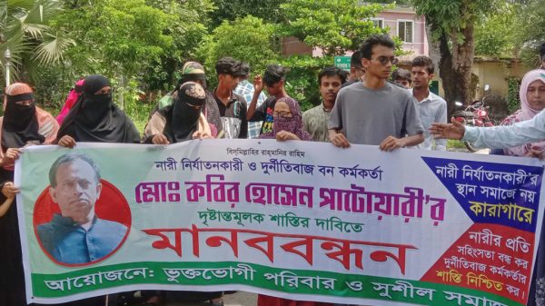 বন কর্মকর্তার বিচার চেয়ে নগরীতে মানববন্ধন। ফাইল ছবি বন কর্মকর্তার বিচার চেয়ে নগরীতে মানববন্ধন। ফাইল ছবি গোপনে একে একে ১৭ বিয়ে করার অভিযোগে বরিশাল বিভাগীয় বন কর্মকর্তা (ডিএফও) কবির হোসেন