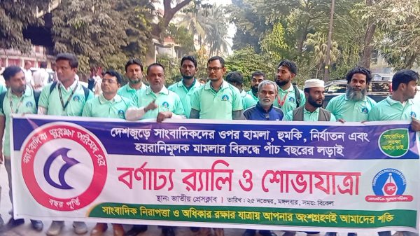 দেশজুড়ে সাংবাদিকদের ওপর হামলা, হুমকি, নির্যাতন এবং হয়রানিমূলক মামলার বিরুদ্ধে গড়ে ওঠা সংগঠন সাংবাদিক সুরক্ষা পরিষদ তার পাঁচ বছর পূর্তি উদযাপন করেছে বর্ণাঢ্য র্যালি ও শোভাযাত্রার মাধ্যমে। মঙ্গলবার ২৫ নভেম্বর